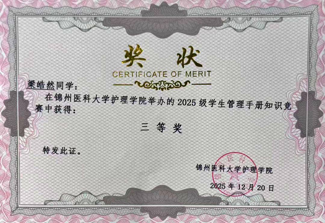 奖状之二十四——获管理手册竞赛奖 一周前,皓然兴奋地提及自己获得了十一假期带回家的那本书的知识竞赛奖项。今天皓然发了奖状图片,祝贺祝贺,这产物着实是久违的奖励了。 回想起皓然十一回家,带的一本16开本还挺厚的书,还是学生管理手册,说是要考核。当时还觉得诧异,医学院都这样?背下来不容易。 发布日期 12/04/2025 发布于 成长历程 标签 校园, 皓然 上篇文章: 大学标配的献血 下篇文章: 温暖而静谧的晚霞