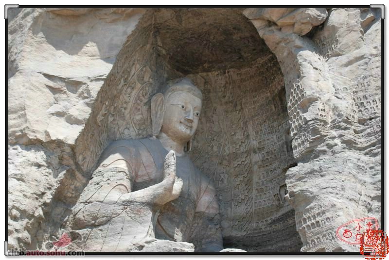 那尊著名的露天大佛——释迦坐像,是云岗石窟的标志,在很多书上都见过他的照片,他直视前方,眼睛清亮,面部表情既肃穆又温柔。看佛时,你我都会看到自己。在他的面前,庸俗的思想突然得到了升华,佛教诲我:千秋万世人心相通,那就是人求永恒、求超越、求解脱的一颗恒古不变之心,你我皆有此心。