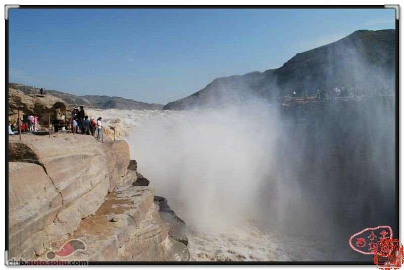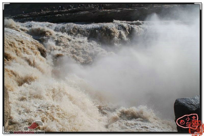 壶口黄河是世界上最大的黄色瀑布,她以排山倒海的雄姿而享誉中外。千里黄河浩浩荡荡,一路向东奔流。在晋陕黄土高原上河面开阔,横无际涯,黄浊的河水翻卷着沸腾着流进峡谷,但流到山西的吉县境内时骤然收成一束,倾泻在高差30米深的石槽中。形似巨壶注水,故名壶口。壶口瀑布有四大奇观:谷涧起雷、群龙嬉浪、水里冒烟、彩虹通天。俺是一个不落,耳闻目睹了。而且,俺特意买了两次门票,从山西、陕西两省不同的角度去欣赏壶口瀑布的雄魂。在停车场就能听到震耳欲聋的声音,远远地看到平地升腾起一团白烟,“快看!那就是壶口瀑布!”我激动地喊道,一手抱着狗狗,一手拉着儿子,兴奋地朝瀑布方向奔去。气喘吁吁的跑到壶口瀑布前,我被深深地震撼了,用惊心动魄来形容黄河壶口瀑布是毫不为过的。两岸布满黄褐色的岩石,宽广的河面被挤在几十米宽的口子里倾泻而下,气势雄浑,巨大的水雾从瀑布底部飞腾而起,在阳光下顺势挥出一道彩虹,俺惊叹大自然的神奇。忽然想起电影《黄河绝恋》中,宁静饰演的八路军女战士站在黄河边上张开双臂似要展翅飞翔,那气势壮阔的背景就是壶口瀑布。还有学生时代红五月歌咏比赛中必唱的《黄河大合唱》又在耳畔回想起来,我今天真的站到了壶口瀑布边上,真正体会到了那雄浑的旋律和磅礴的意境,领略了黄河不凡的个性。