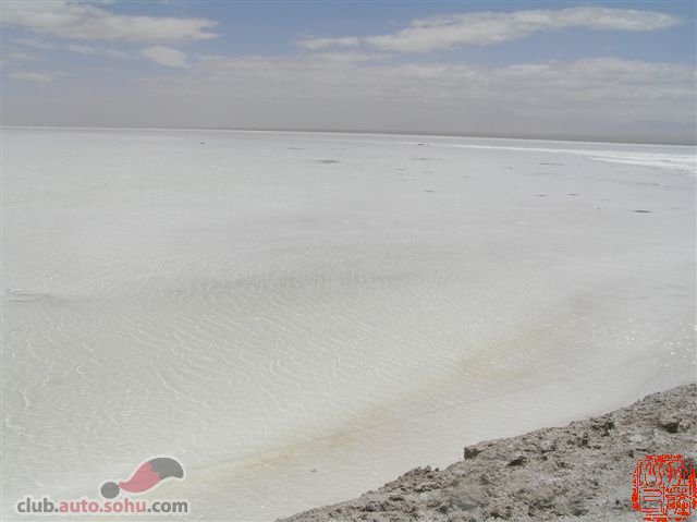 过了橡皮山,就是柴达木盆地的边缘了,茫茫戈壁了。在平直又几乎没有车的路上开了一个多小时,我们到了漠河盐场,由于正是中午真个盐场没有一个人,奇怪了!网上游记说要买票的,没人更好j,一进厂区,两边是堆积如山的盐,还有几辆锈蚀的车辆,更象拍电影的地方。远处的盐湖白茫茫的一片,也是看不到边。把车开上盐桥,两边的景色更美了,开始怀疑自己置身了北极。要戴上墨镜,太晃眼!湖水有的是绿色,靠近岸边有的成椭圆形,在岸边有各种形状的结晶。第一次到盐湖所有一切都这么新奇。盐湖的风很大,至少有6级。疯狂拍照后,恋恋不舍的离开了。后来在回京的火车上和一个青海人聊天,才知道漠河盐场已经倒闭了,所以才一个人也看不到!原路返回青海湖,路上大家都很兴奋,没有一点困意,朋友说在路边留个影吧,这可是从北京一直到拉萨的109国道呀,躺在路上,放松呀!