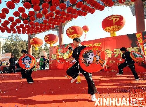 这是北京地坛庙会上的武术表演(2月6日摄)。庙会是北京春节期间重要的文化活动。与往年不同的是,2008年春节北京举办的各大庙会在展示民俗文化的同时,奥运气氛和奥运特色浓郁,形成一道“奥运风景”。新华社记者张旭摄