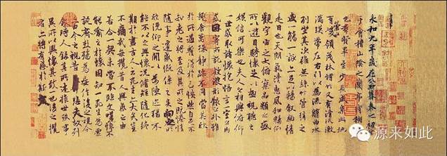 唐代的韩偓也曾用:“怪石奔秋涧,寒藤挂古松。若教临水畔,字字恐成龙。” 来评价怀素的草书。“怪石奔秋涧,寒藤挂古松。”是说怀素草书中的点,好像怪石正在向秋涧奔走。竖和钩,真像枯藤挂在古松上。两句中虽只点出点、竖和弧钩这些个别笔画,但却依然可以让人想象到那种运笔时饱满、刚劲、浑厚的效果。无一字不飞动,无一字不活泼,体现了狂放、豪纵的气韵。甚至让人担心“若教临水畔,字字恐成龙。”如果把写了字带到水边,每个字恐怕都要化成龙,游到水里去了。